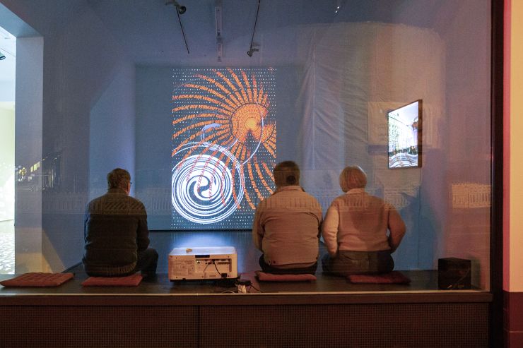Die visuellen Eindrücke wurden auch musikalisch begleitet. Mit der Unterstützung des Klang- und Medienkünstlers Seppo Gründler verwandelten sich die bereits beschriebenen Trichter zugleich in Klanginseln, die einen kontinuierlichen, teils sich kontrastierenden, teils suchaddierenden Klangraum bildeten und je nach Standpunkt der Besucher:innen anders wahrgenommen wurden."