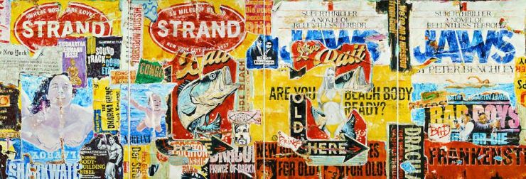 In seiner typischen collageartigen Malweise verknüpft er scheinbar disparates Material zu einer dichten, erzählerischen Struktur, in der sich Popkultur, Literatur, Musik und Geschichte auf faszinierende Weise durchdringen.