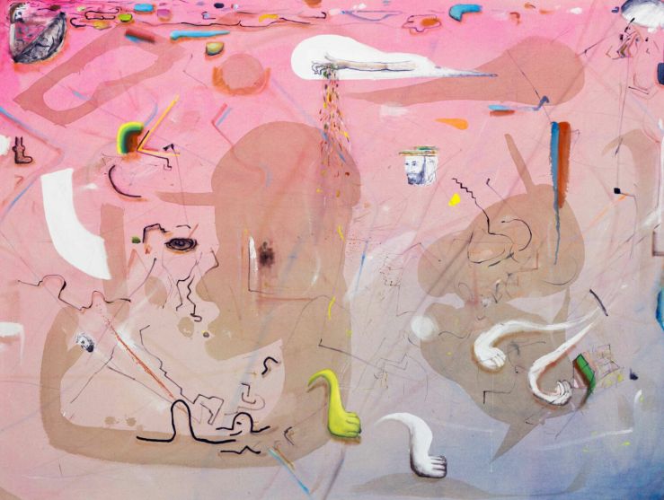 Roy Mordeschay: The streaming duck, 2020, watercolor-coffee-acrylic-and-oil-on-canvas, 141x191 cm