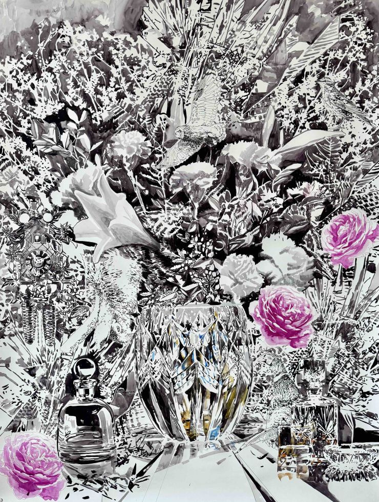 Malgosia Jankowska: Stillleben mit Kristall, Tusche auf Papier, 130 x 110 cm